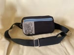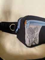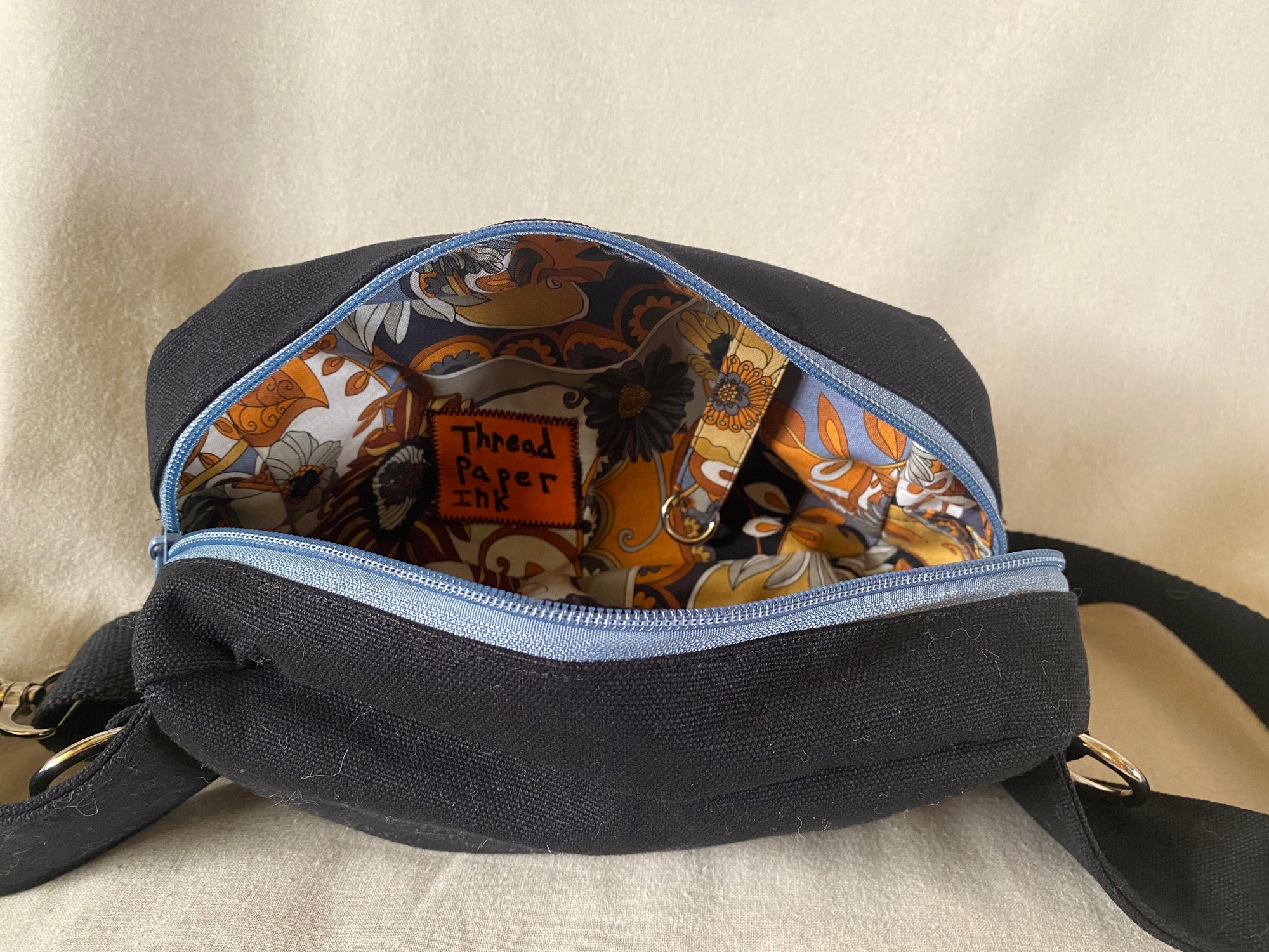 Made from 100% Cotton Duck Canvas and lined with 100% Cotton Broadcloth. The strap is 1 1/2" wide Cotton Webbing. It can be worn around the waist or thrown over your shoulder as a small pack. The block prints are all carved and pressed by me. I used Speedball Fabric Block Printing ink. Each bag has an two internal rings for whatever you want to keep safe, one in the main pocket and one in the outside pocket. I choose hardware that is durable and also fun.