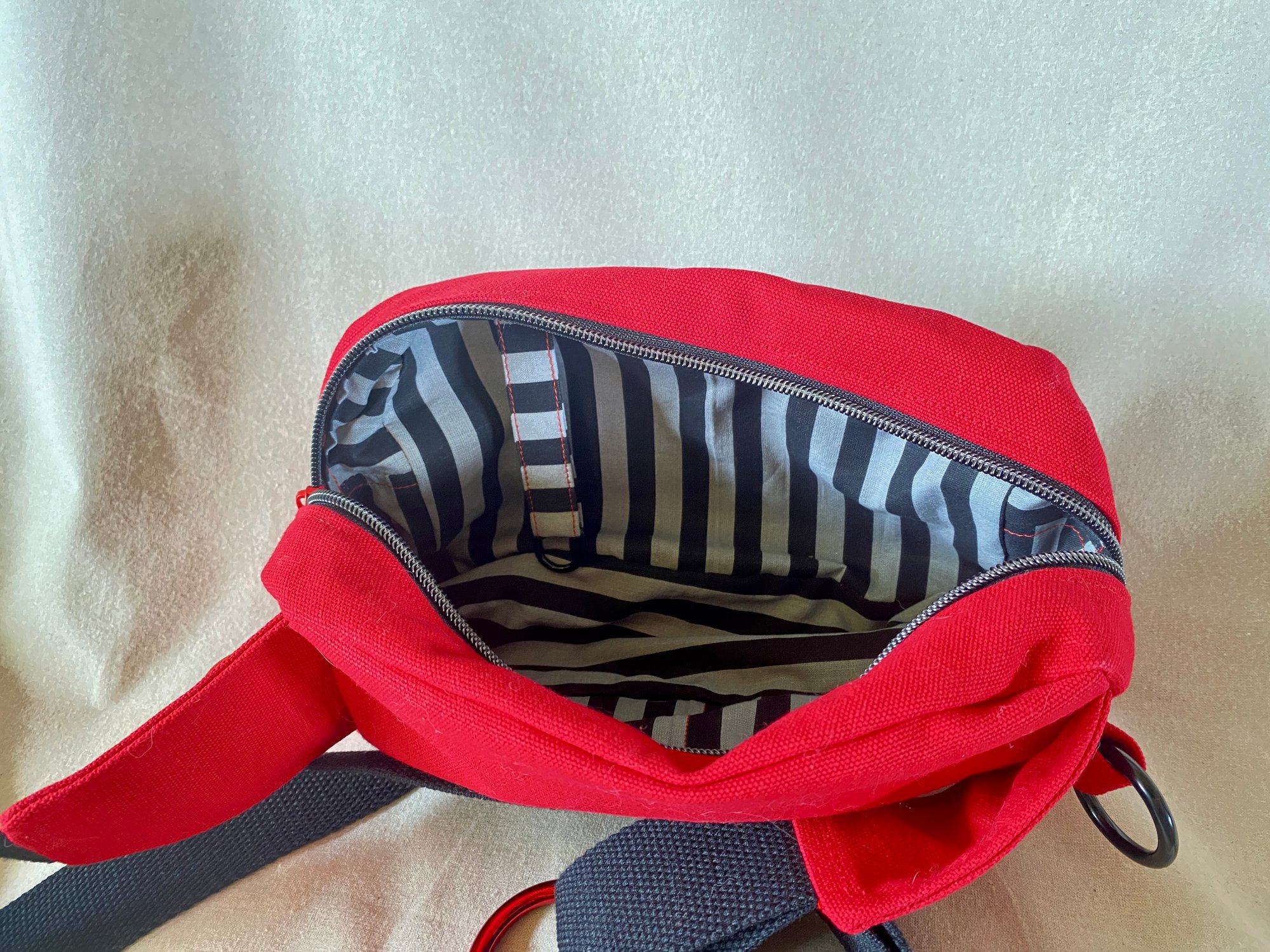 Smile is printed with white ink on black fabric. All stitching is red so there is some contrast in places. Strap is black. O ring is iridescent "candy" red, slider and swivel snap are shiny black. Smaller O rings on sides of back are one red and one black. Zipper tape is black with gunmetal grey teeth and red zipper pulls. Interior key ring is black. Interior fabric is grey and black stripes.