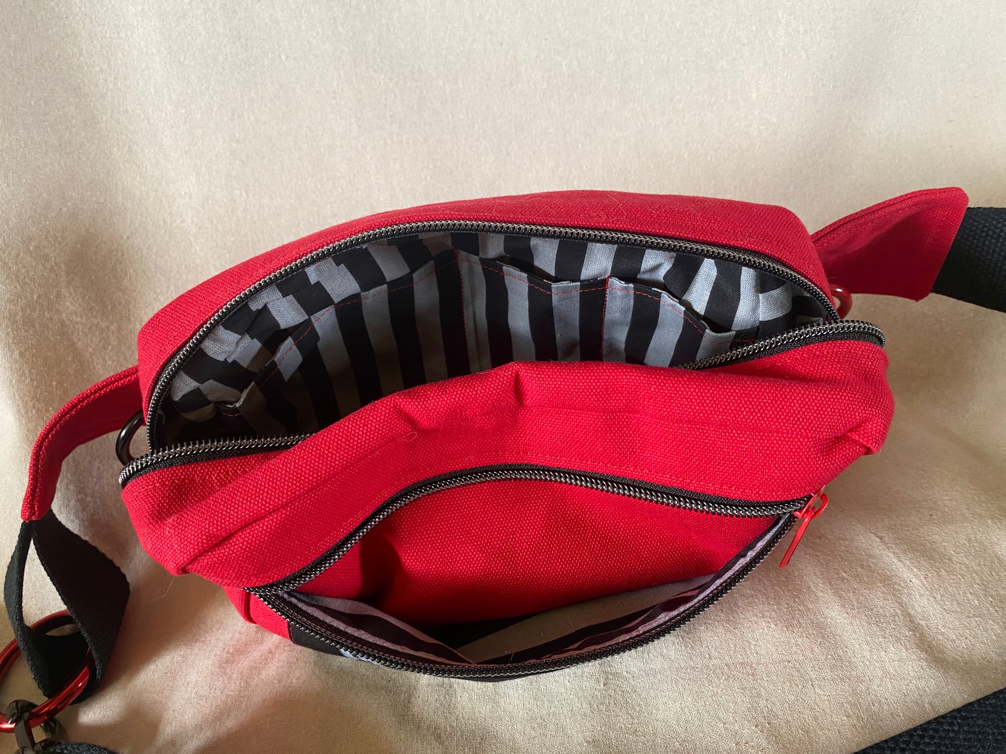 Made from 100% Cotton Duck Canvas and lined with 100% Cotton Broadcloth. The strap is 1 1/2" wide Cotton Webbing. It can be worn around the waist or thrown over your shoulder as a small pack. The block prints are all carved and pressed by me. I used Speedball Fabric Block Printing ink. Each bag has an two internal rings for whatever you want to keep safe, one in the main pocket and one in the outside pocket. I choose hardware that is durable and also fun.