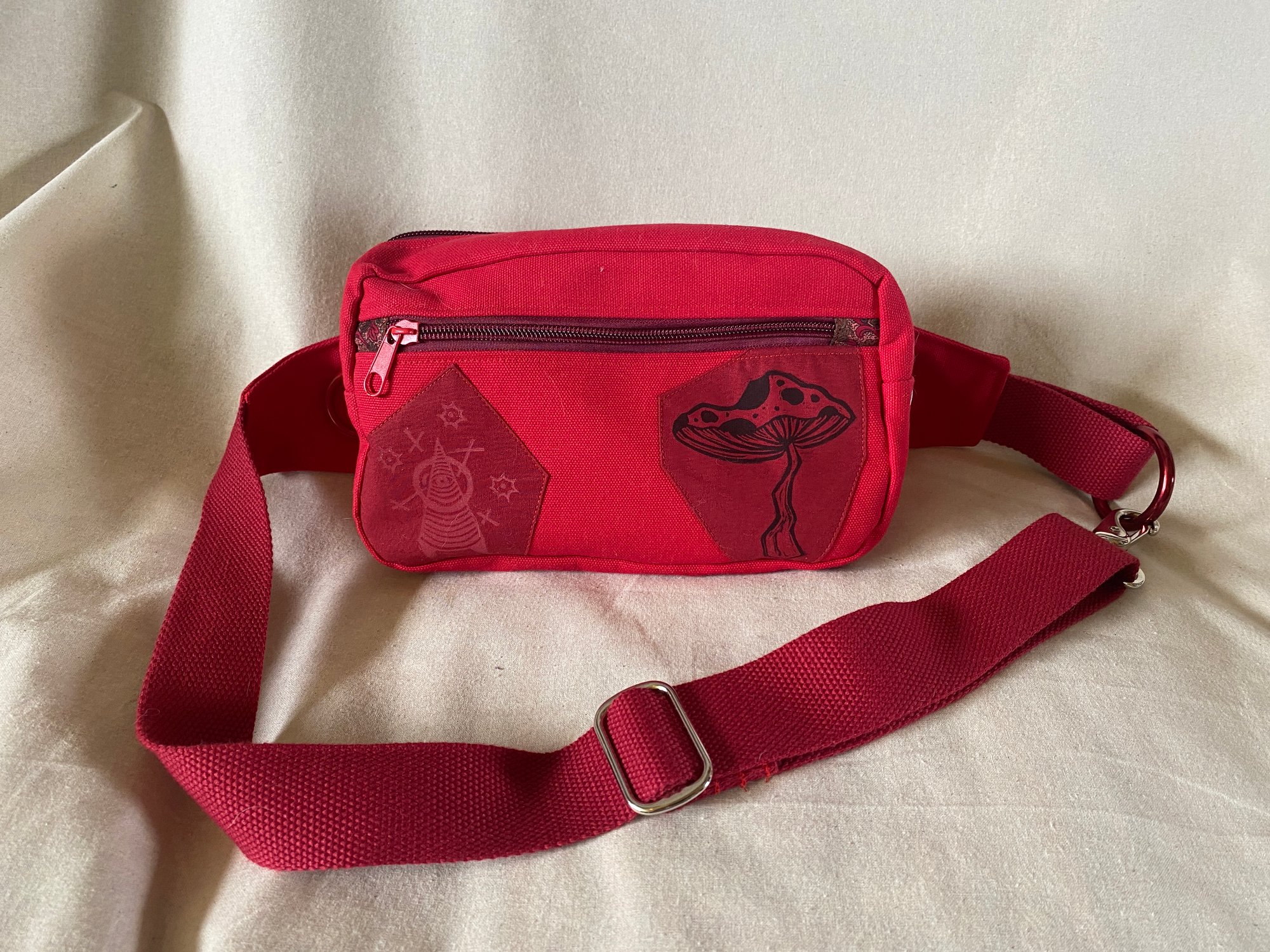 Bright Red fanny pack with Mushroom and Esoteric Eye patches