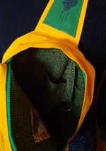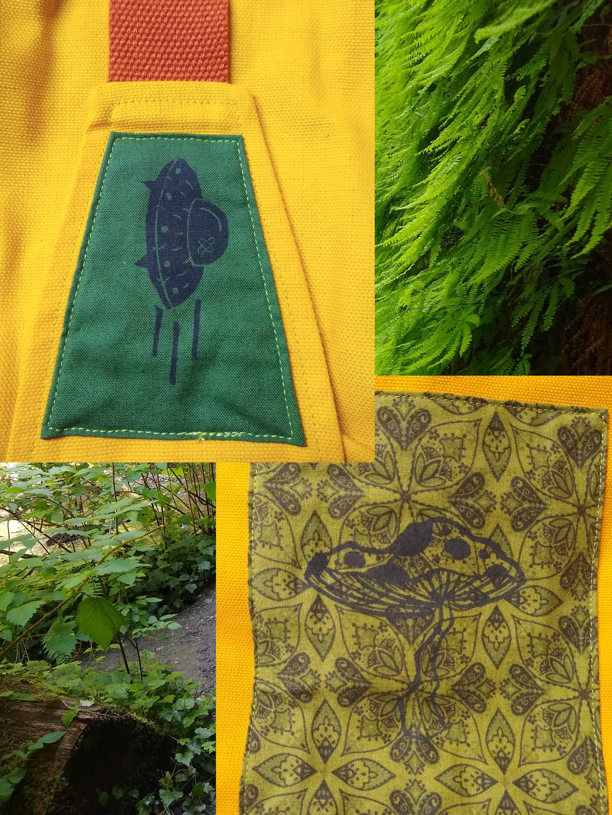 Mushroom is printed on a mossy green fabric with a geometric print, spaceship is printed on a forest green fabric, and interior logo patch is printed on a floral print fabric. Strap is a rust orange color. Interior key rings are bronze. Main zipper is an apple green and small front zipper is a bright yellow green. Interior fabric is a green on green fern print. Slider, swivel snap, and triangle rings are all silver.