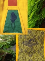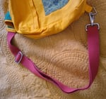 Made from 100% Cotton Duck Canvas and lined with 100% Cotton Broadcloth. The strap is 1 1/2" wide Cotton Webbing and it can be switched to either side depending on how you wish to wear the bag. I also tend to swing it around to the front and carry it that way. The block prints are all carved and pressed by me. I used Speedball Fabric Block Printing ink. Each bag has an two internal rings for whatever you want to keep safe, one in the main pocket and one in the outside pocket. I choose hardware that is durable and also fun.