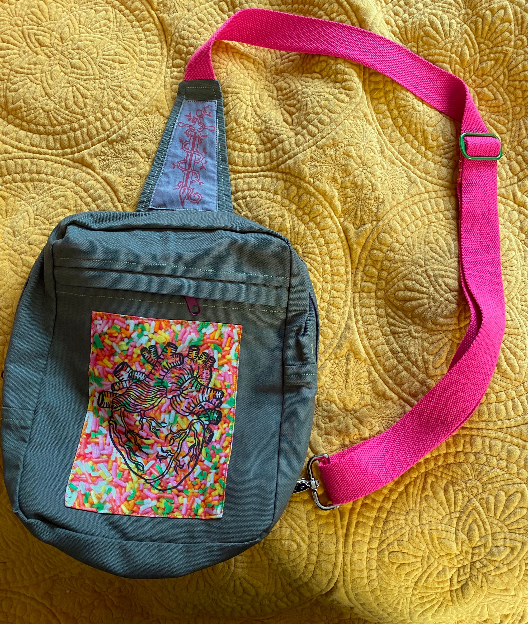 Anatomical heart is printed in black ink on a bright multicolored sprinkle fabric. Sword is pink ink on grey fabric. Strap is a bright pink color. Main pocket interior key ring is multicolored and front pocket interior key ring is silver. Zippers have lavender zipper tape with gunmetal grey teeth and maroon zipper pulls. Interior fabric is a black with a magical theme print. Slider is bright green, swivel snap is silver, and large O rings are fuschia.