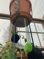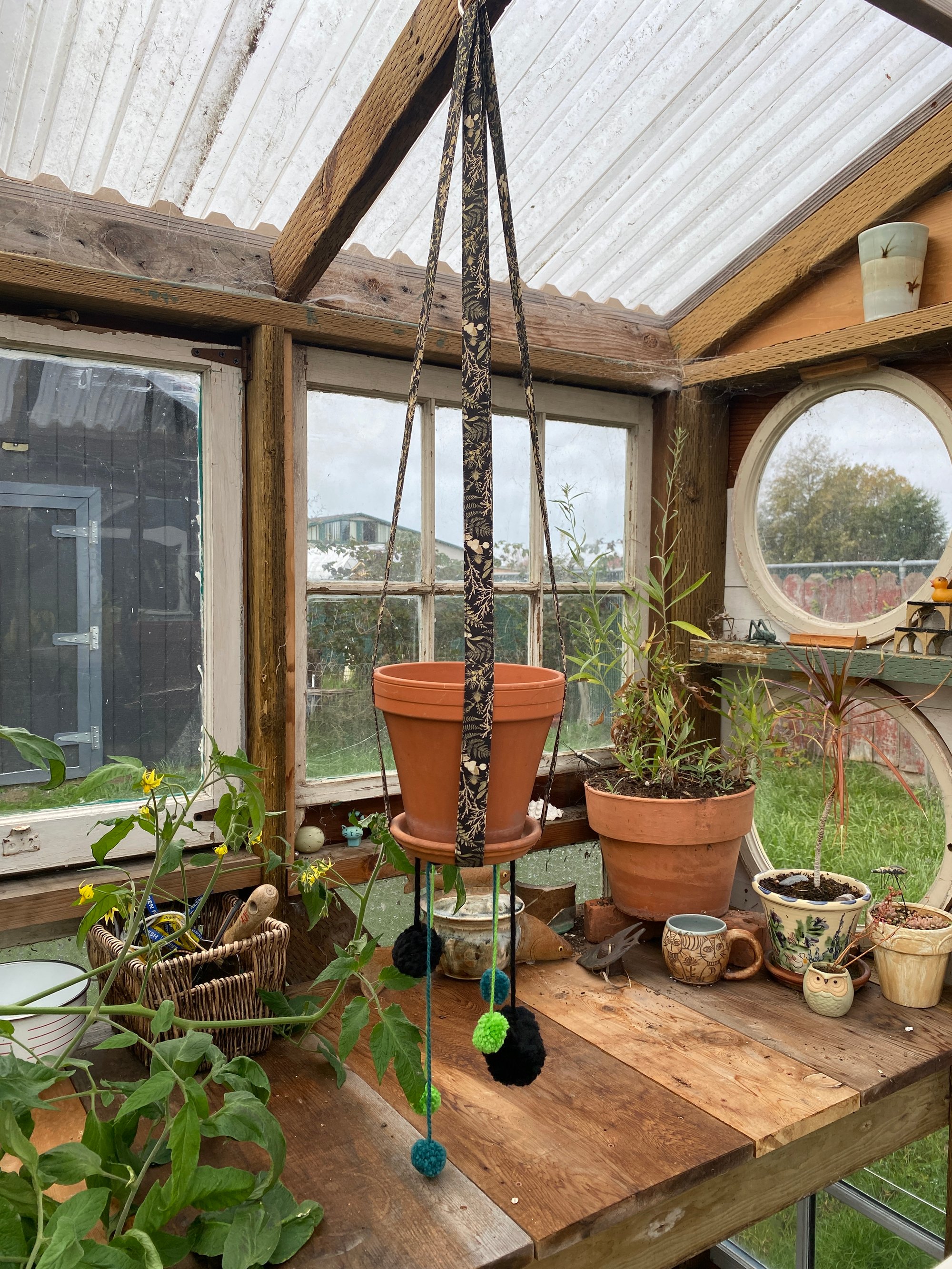 Straps are black with a forest plants print. The circle underneath is a triangle eye block print in green ink on grey fabric. Pom Poms are black, bright green, and turquoise.