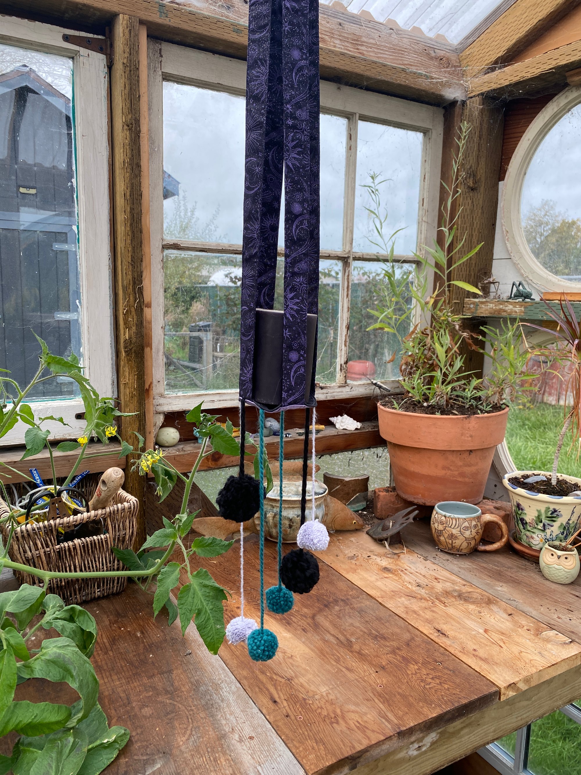 Straps are dark purple with sun, moon, and stars print with a glittery shine. The circle underneath is a triangle eye block print in peach ink on lavender fabric. Pom Poms are black, lavender, and turquoise.