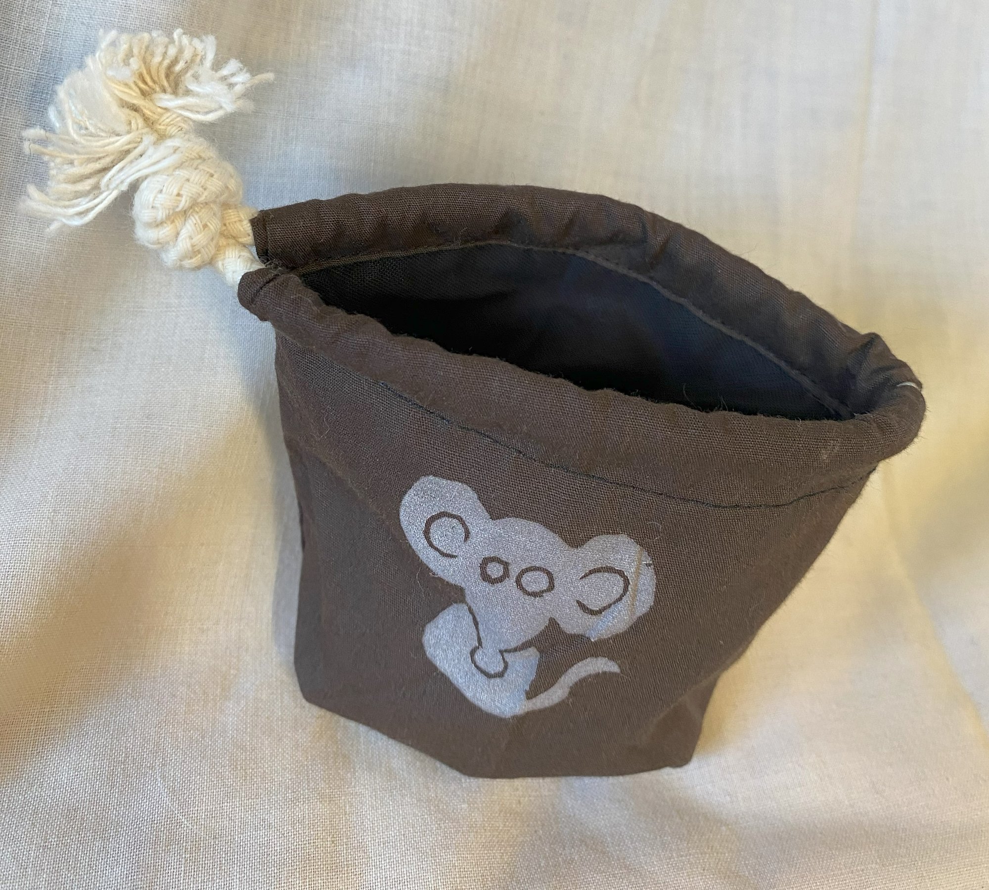 Small drawstring bag made from 100% cotton broadcloth. The outer fabric is dark brown with a black lining. The cord is white and 100% cotton. Thread is black. The bag itself is about 3" tall with an opening of 3 3/4" wide.