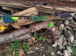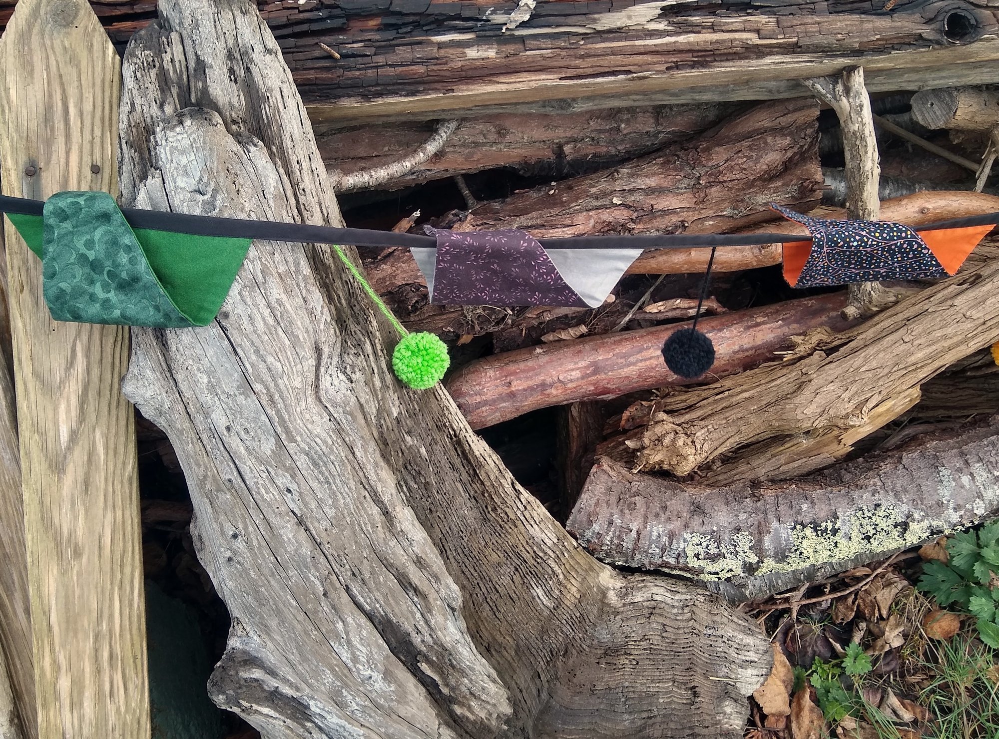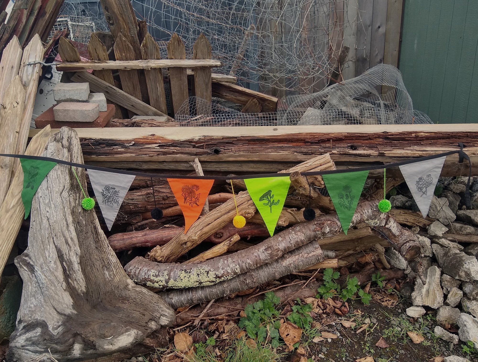 All flower block prints are based on photos taken in my garden. Each pennant flag garland features Strawberry, Borage, Dead Nettle, Yarrow, Dandelion and Chamomile. The front of the flags are a random rotation of bright orange, bright green, light grey and forest green. The pom pom colors vary between golden yellow, bright green and black. These are entirely patterned, cut and sewn by me!