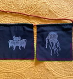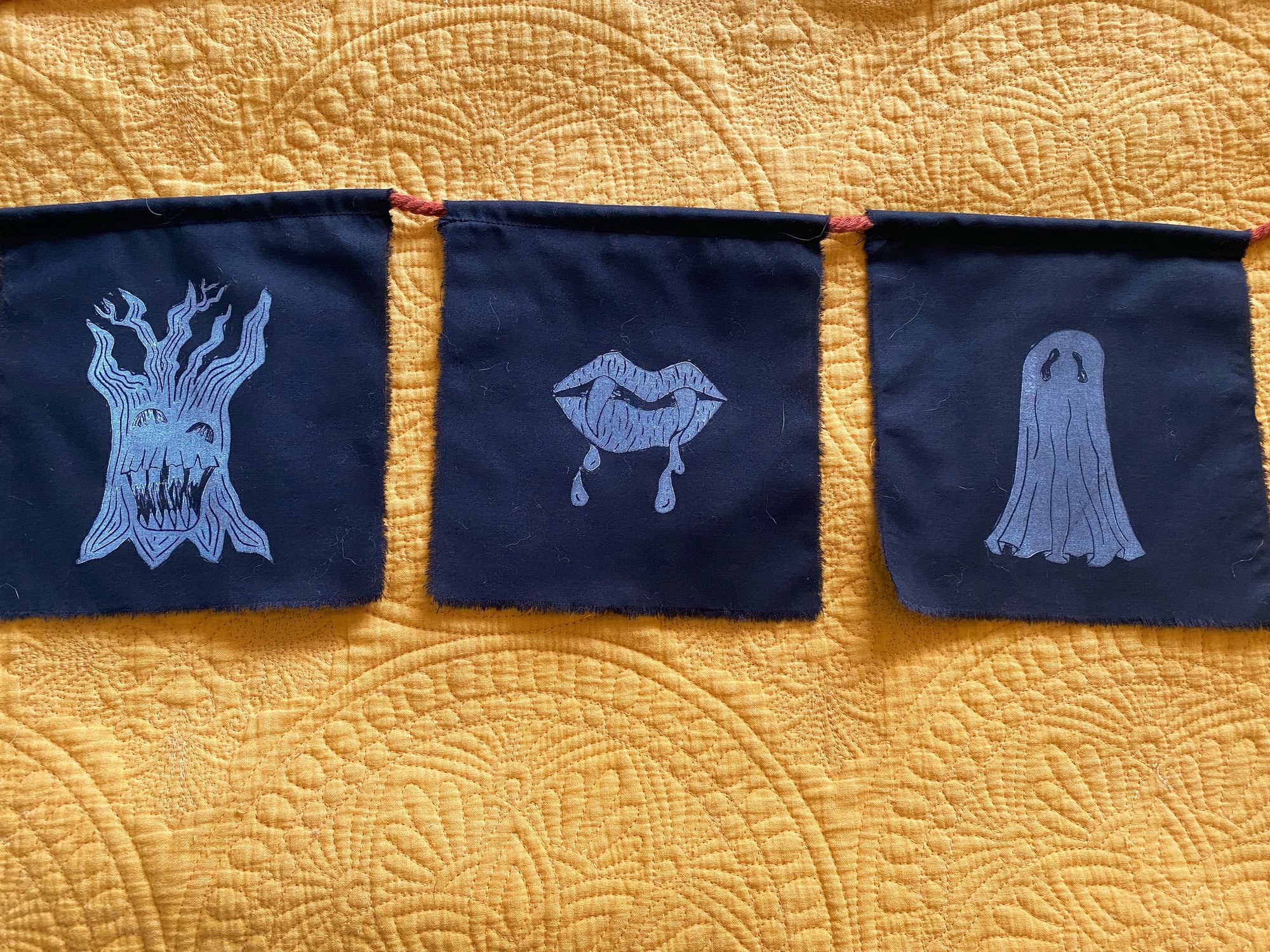 White ink on black fabric. Fabric is 100% cotton broadcloth. The cord is dark orange cotton macrame cord. All block prints designed and carved by me.