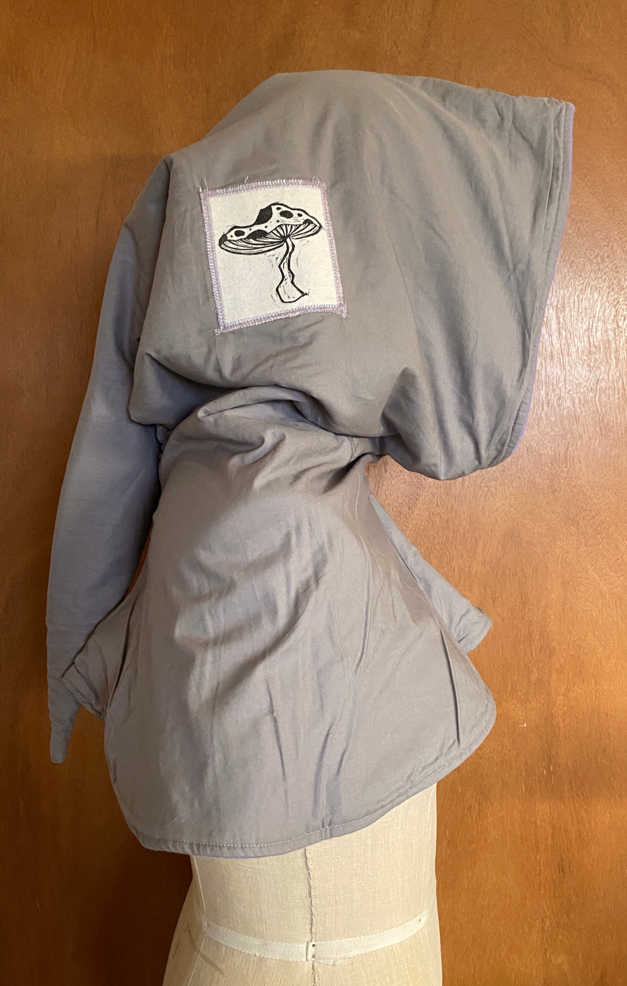 One side is 100% cotton light grey broad cloth with a block printed mushroom patch on both sides of the head. The reverse is lavender cotton fleece with a block printed crown patch on both sides of the head.