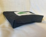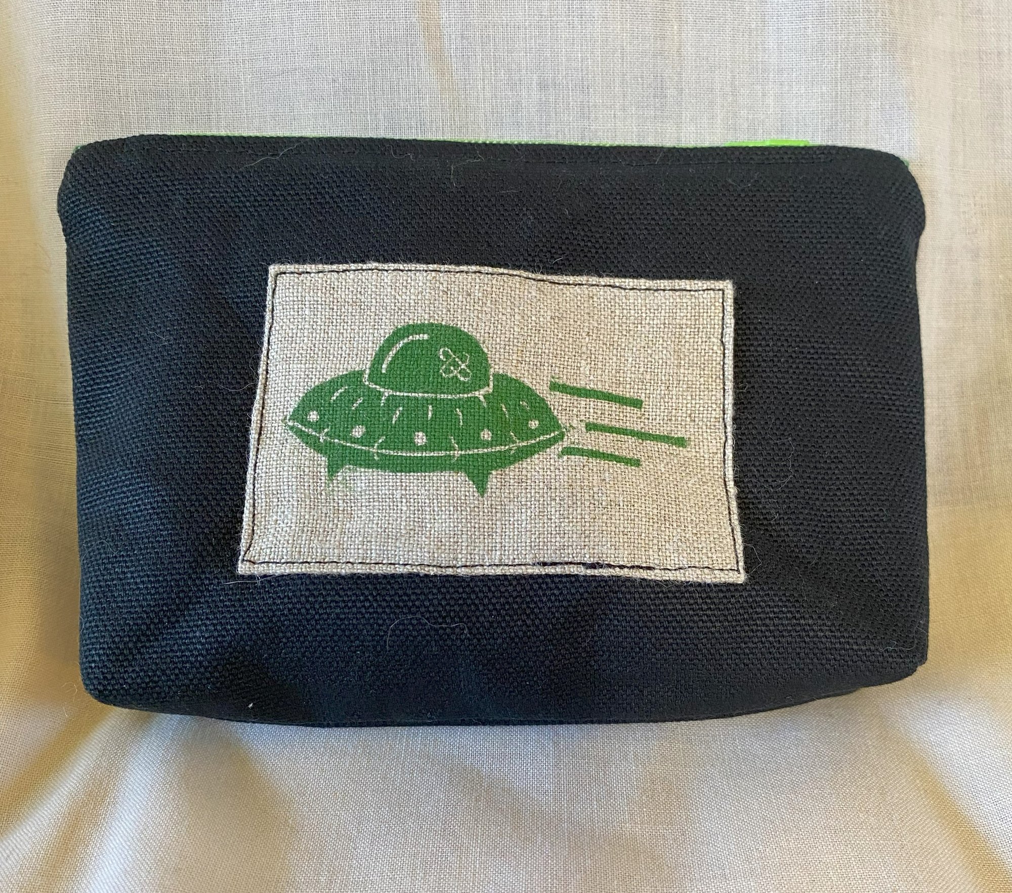 Black fabric on the outside, dark moth print lining, bright green zipper, black thread, block print patch is green ink on natural linen fabric.