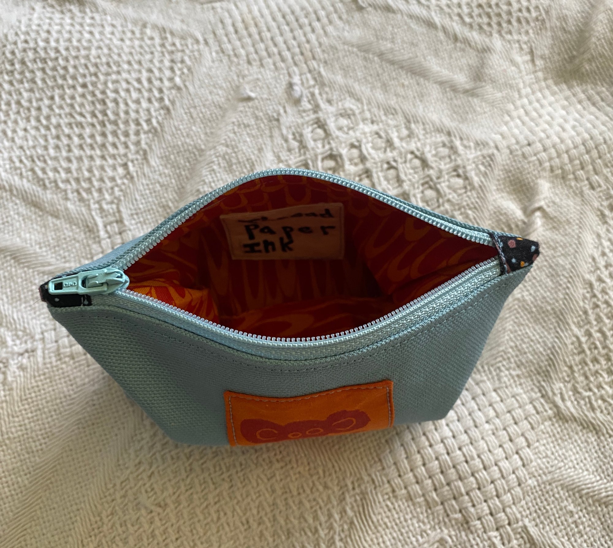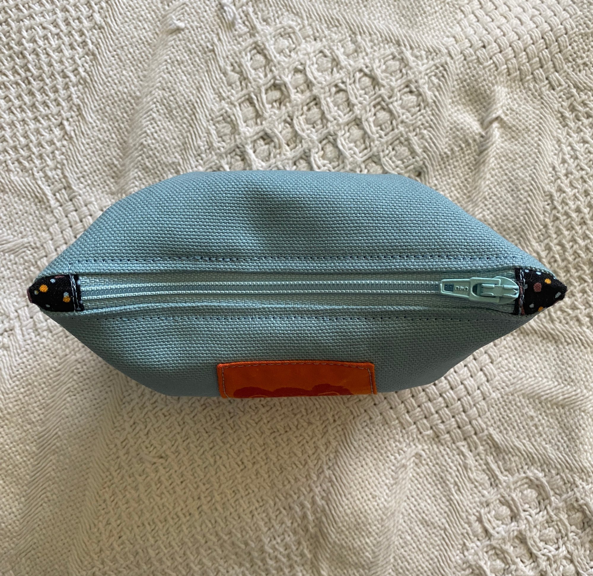 Light blue fabric on the outside. Red and orange swirl print lining, light blue zipper, light blue thread, block print patch is red ink on orange fabric.