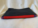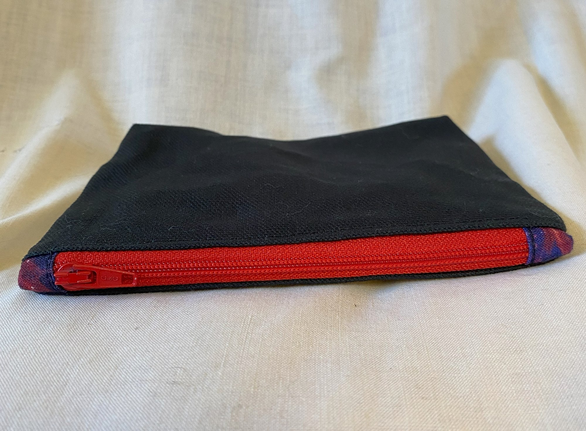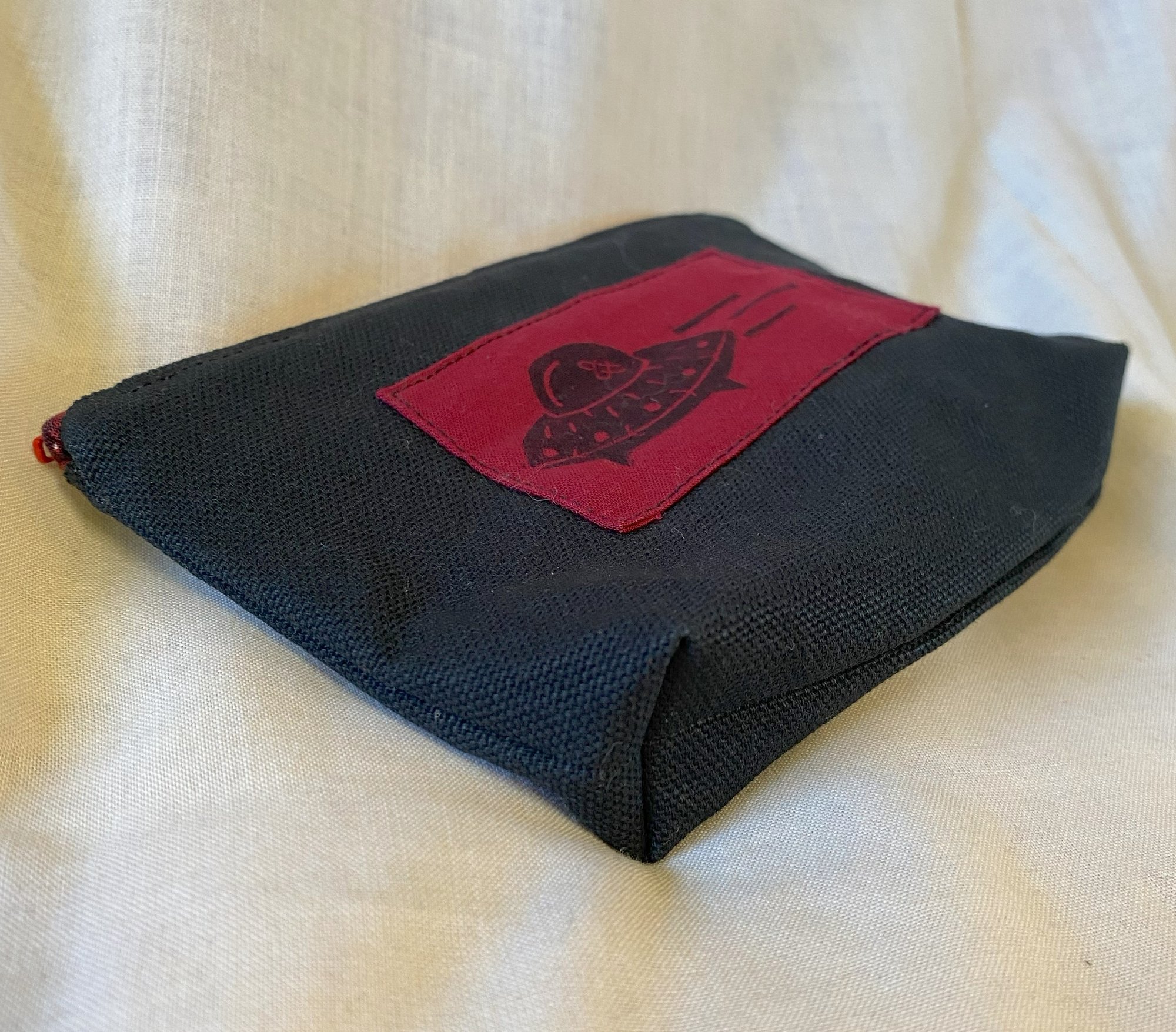 Black fabric on the outside, dark moth print lining, bright red zipper, blue and red zip tabs, block printed patch is black ink on maroon fabric, black thread.